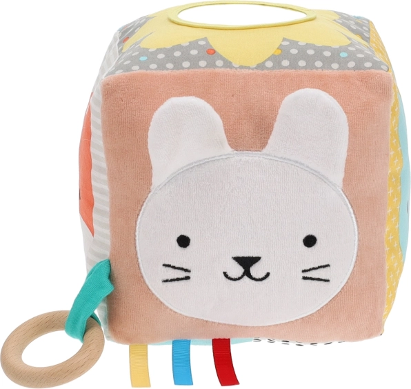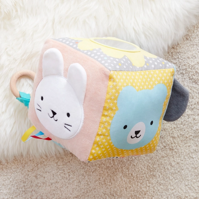Dit textiele blok is perfect ontworpen voor de zintuiglijke ontwikkeling van je kind. Dankzij een scala aan activiteiten, zoals vriendelijke dierengezichten en verschillende stoffen, is het ideaal voor het verkennen van elk klein detail.