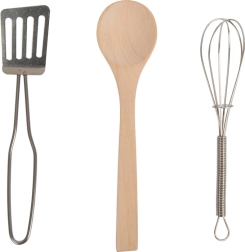De pan met afneembaar deksel draagt bij aan realistische speelscenario’s en stimuleert de verbeelding. De houten lepel samen met metalen tools zoals de spatel en garde bieden een brede keuze aan speelmogelijkheden. De stoffen ovenwant en de pannenonderzetter geven een authentiek tintje en dragen bij aan de veiligheid tijdens het spel.