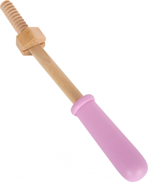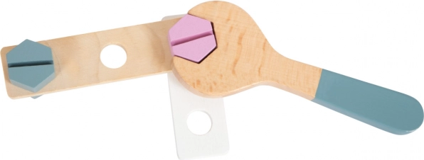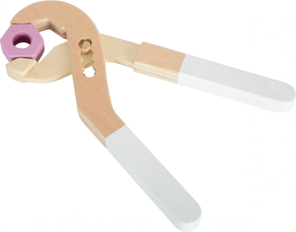 Houten gereedschap, waaronder pijpentang, ratel, schroevendraaier en sleutel, biedt diverse speelmogelijkheden en leren.