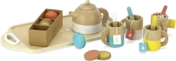 De set bevat: 4 kopjes, 4 lepeltjes, 1 theepot, 4 theezakjes, 2 macarons, 4 koekjes in een doosje en 1 dienblad. Alles is gemaakt van hoogwaardig hout met gladde randen voor veilig en langdurig speelplezier. Stimuleert de ontwikkeling van verbeelding, taal en sociale vaardigheden.