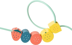 Gekleurde kralen in de vorm van fruit op een flexibele draad stimuleren de fijne motoriek en bewegingscoördinatie tijdens het dagelijks spel.
