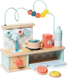 Deze kwalitatieve houten keuken van VILAC combineert motorische activiteiten met realistische keukenelementen. Kinderen kunnen aan de knoppen draaien, de ovendeur openen, een “vis” koken in de pan en water laten lopen in het gootsteentje, terwijl de kleurrijke doolhof met fruit en de stapelbare zout- en fles de fantasie en oog-handcoördinatie stimuleren.