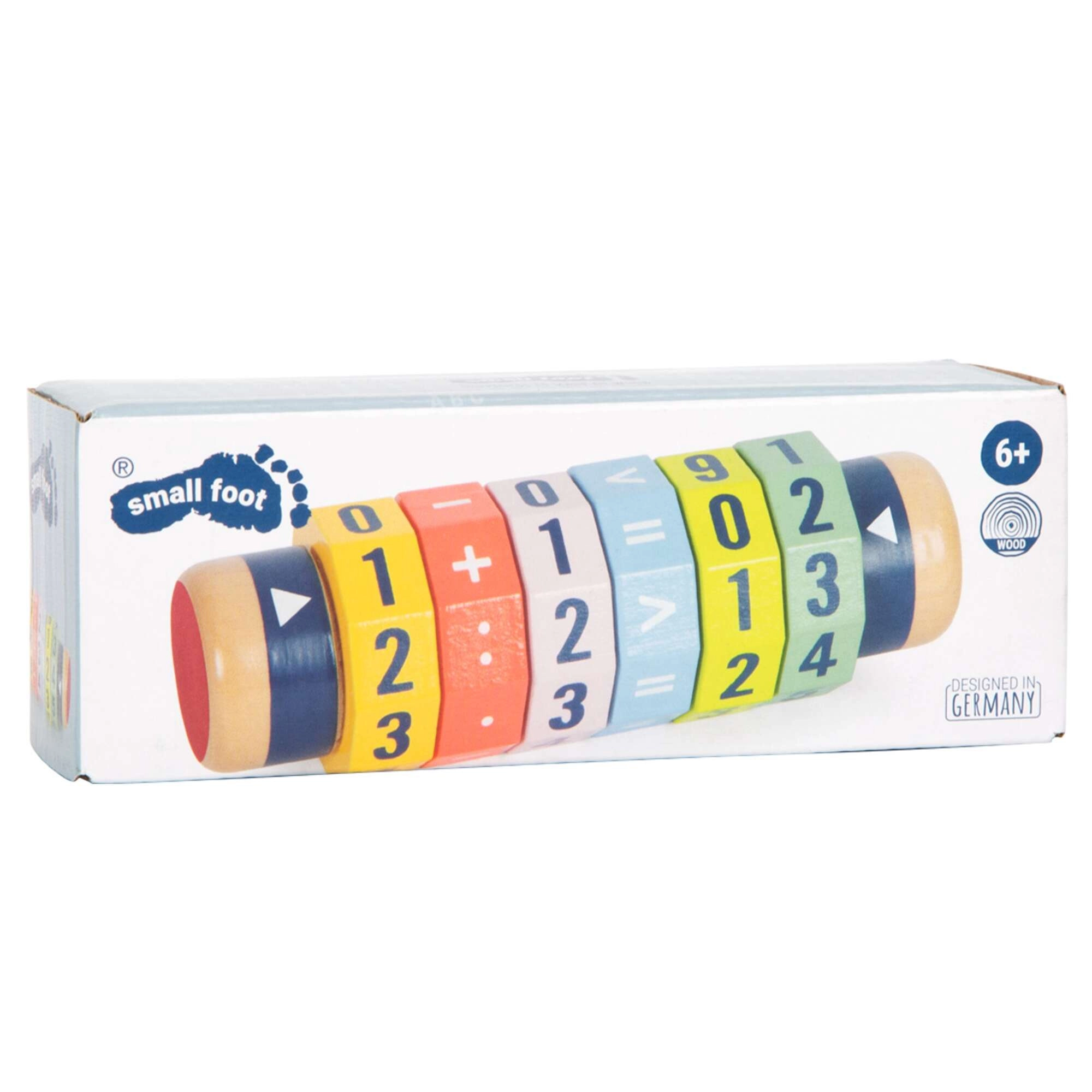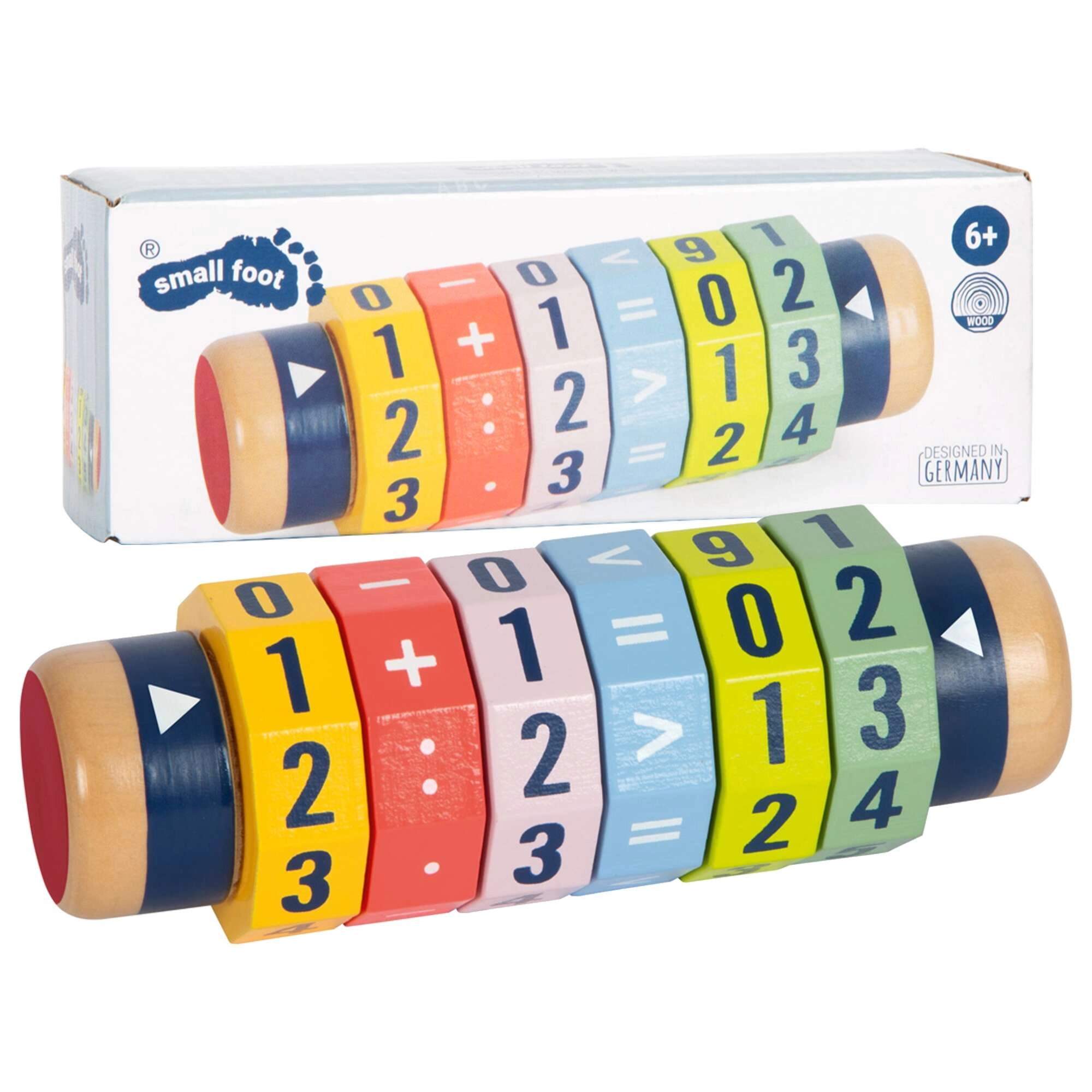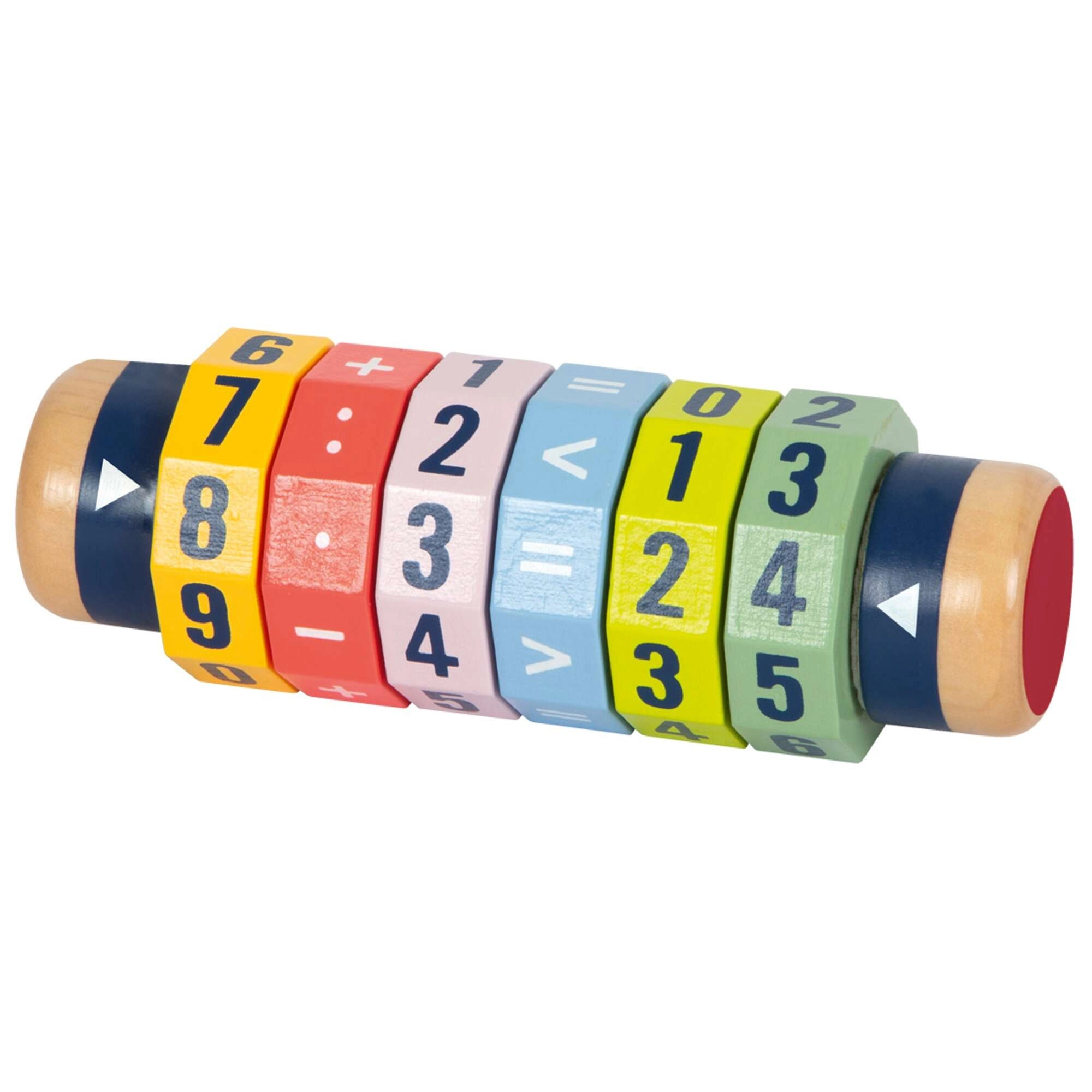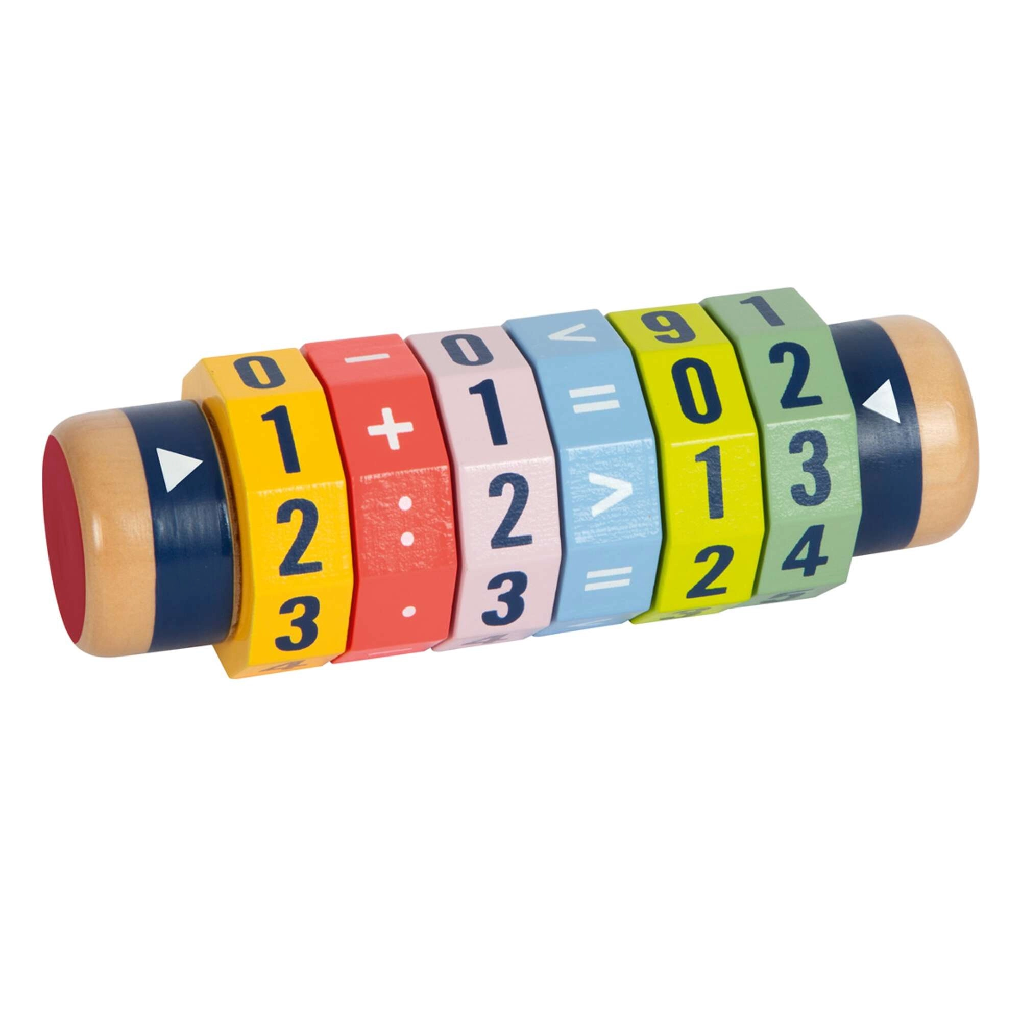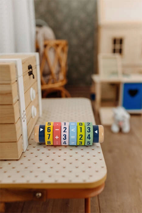 Ontdek een leuke weg naar wiskunde. De houten cilinder met zes draaibare ringen laat kinderen eenvoudige en complexere vergelijkingen en getalvergelijkingen maken. Dankzij de heldere kleuren en opvallende cijfers leren kinderen spelenderwijs en versterken ze hun fijne motoriek en concentratie.