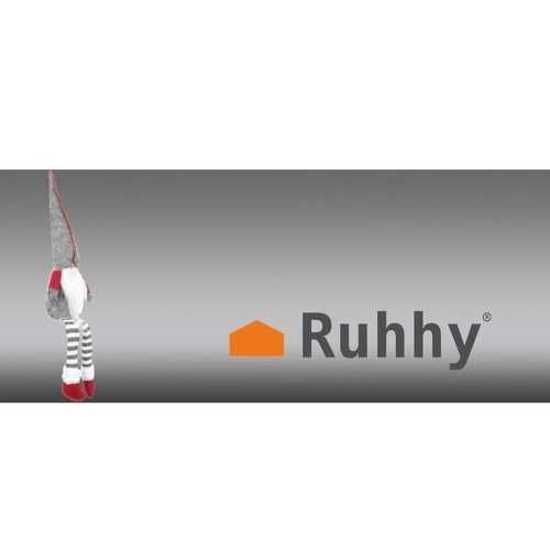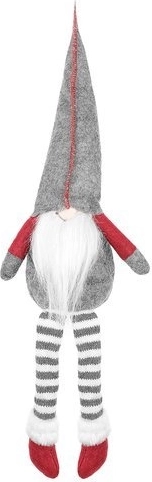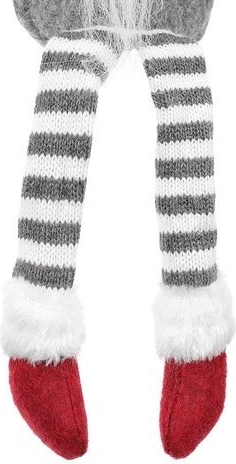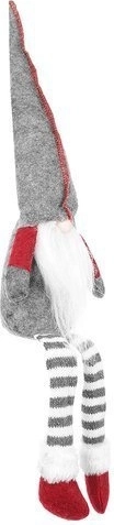 De textiele decoratieve kabouter in grijs-rode uitvoering heeft een typische hoge, puntige muts, lange gestreepte benen en een zachte witte baard. Dankzij het speciale profiel aan de achterkant zit hij stabiel op de rand van een tafeltje of plank en geeft hij het interieur een warme, knusse uitstraling.