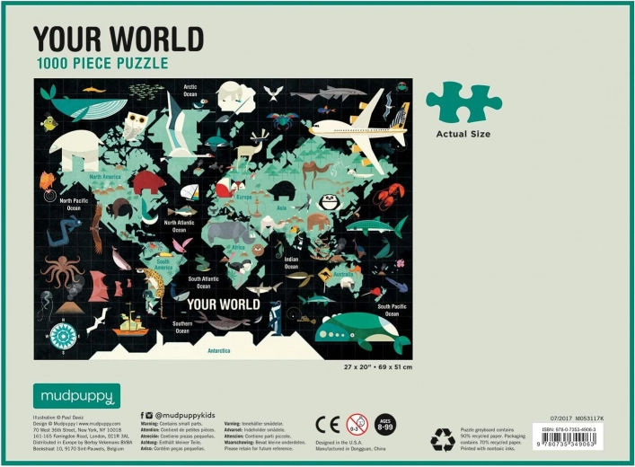 Ontdek de wereld van plezier met de familiepuzzel Mudpuppy “Jouw wereld” met 1000 stukjes. Premium kwaliteit, niet-giftige inkten en perfect passende stukjes zorgen voor een geweldige ervaring voor zowel kinderen als volwassenen. Ideaal voor samen puzzelen en het ontwikkelen van logisch denken en fijne motoriek.