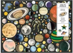 De puzzel toont het universum met kleurrijke planeten en een astronaut, wat zowel educatieve als decoratieve waarde biedt.