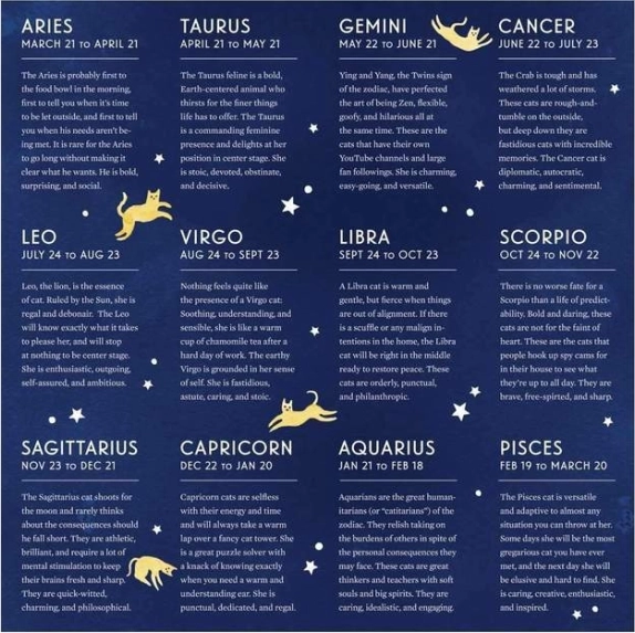 Elk sterrenbeeld is uniek weergegeven en brengt de essentie van het teken over in een speelse kattensfeer.
