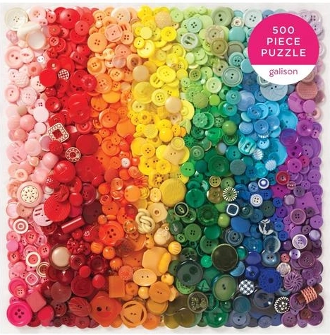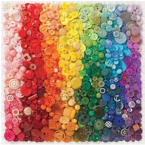 Deze puzzel bevat knopen gerangschikt in een kleurrijk spectrum, wat een visueel aantrekkelijke ervaring biedt.