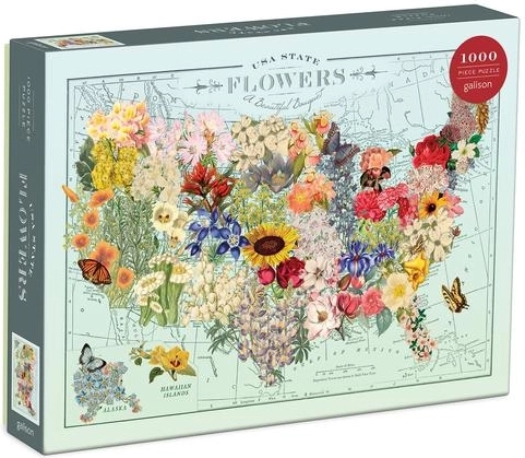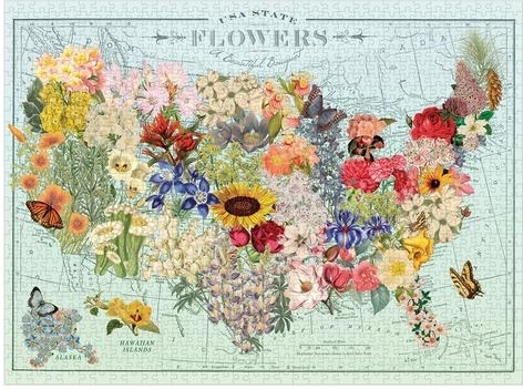 Geniet van het leggen van een prachtige puzzel met een illustratie van de populaire kunstenares Wendy Gold. Deze puzzel van 1000 stukjes toont de bloemen van de afzonderlijke Amerikaanse staten en is gemaakt van hoogwaardig gerecycled papier.