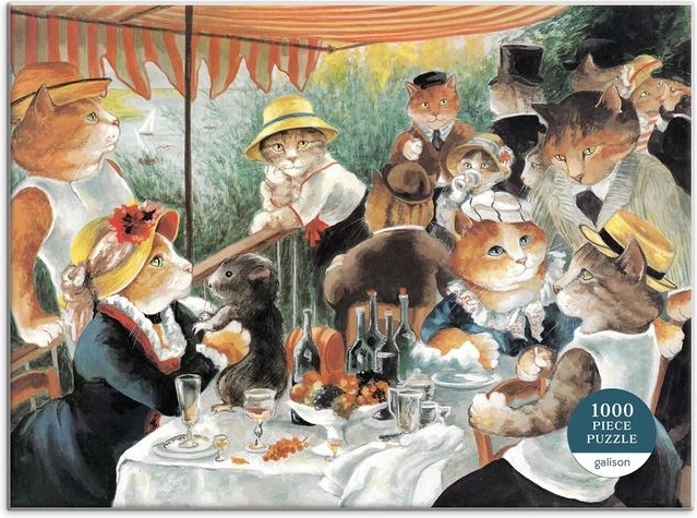 Ontdek een unieke puzzel die kunst en humor verenigt. De parodie op Renoirs beroemde schilderij Ontbijt van de roeiers in de interpretatie van kattenkunstenares Susan Herbert zal liefhebbers van katten, kunst en kwaliteitspuzzels bekoren. De premium afwerking en zorgvuldig uitgesneden stukken zorgen voor een aangename ervaring bij elke legsessie.