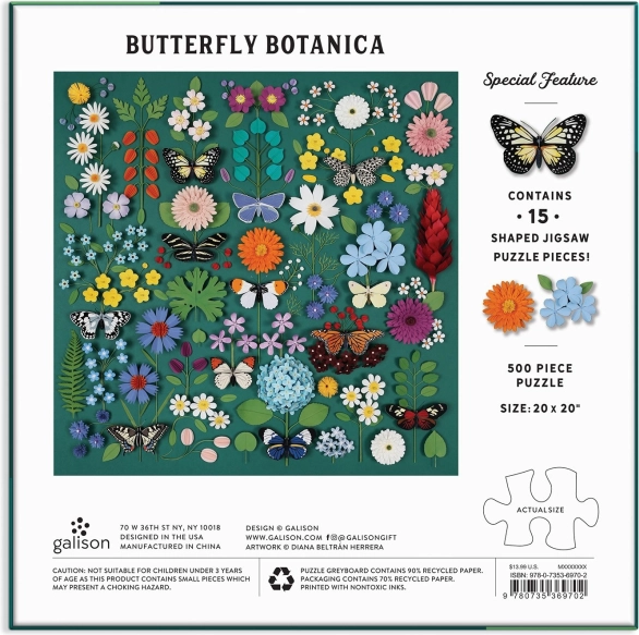 De Butterfly Botanica-puzzel brengt plezier aan alle liefhebbers van natuur en ontspannen vrije tijd. De rijke botanische illustratie met levendige vlinders en bloemen komt prachtig tot zijn recht in het formaat 50,8 × 50,8 cm. Dankzij 15 uniek gevormde stukjes is het puzzelen nog leuker en visueel aantrekkelijker.