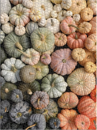 Het designmotief “Heirloom Pumpkins” van Christine Chitnis brengt een bont palet van paarse, groene, gele en oranje pompoenen. De puzzel is verpakt in een matte, stevige doos, die ook uitstekend dienstdoet als cadeauverpakking of stijlvolle opbergbox. In de doos vind je bovendien een volledige kleurenposter van het eindbeeld.