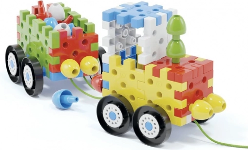 Bouw auto’s, huisjes en bomen van plaatjes en pinnetjes! Deze innovatieve bouwset bevat onderling koppelbare platte 3D-onderdelen en grote pinnetjes in verschillende kleuren, waarmee ook kleine kinderen allerlei autootjes, huizen, torens, bomen en veel meer kunnen maken. Tussen de in totaal 62 onderdelen zitten ook 8 wieltjes voor de onderstellen van de autootjes en 3 koordjes waarmee de autootjes kunnen worden voortgetrokken. Behalve verschillende autootjes maakt de set ook het bouwen van diverse vlakke en driedimensionale structuren mogelijk, waardoor bij kinderen van 2 tot 6 jaar de fijne motoriek, hand-oogcoördinatie en ruimtelijk inzicht worden geoefend en ontwikkeld, en tegelijk hun cognitieve ontwikkeling wordt gestimuleerd. Inhoud van de verpakking: 20 onderling koppelbare platte 3D-onderdelen, 16 onderling koppelbare pinnetjes, 8 wieltjes, 3 koordjes om autootjes te trekken. Belangrijkste kenmerken: ontwikkelt fijne motoriek, creativiteit, fantasie en logisch-combinatorisch denken; verpakking bevat 52 onderdelen; voor kinderen vanaf 2 jaar. Afmetingen verpakking: 40x34x9 cm. Leeftijd: 2+. Materiaal: plastic. Bevat 62 onderdelen.