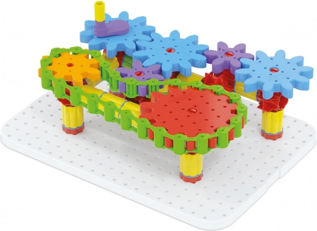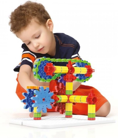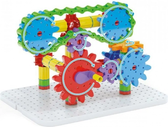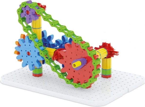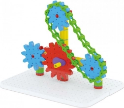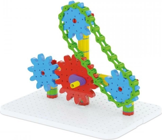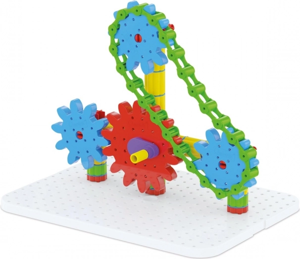 De bouwdoos is gemaakt van duurzaam plastic en is ontworpen voor kinderen vanaf 5 jaar. Het bevat componenten zoals een witte basisplaat, tandwielen van verschillende formaten, een ketting en nog veel meer, waardoor kinderen een nieuwe wereld van mechanische bewegingen kunnen ontdekken.