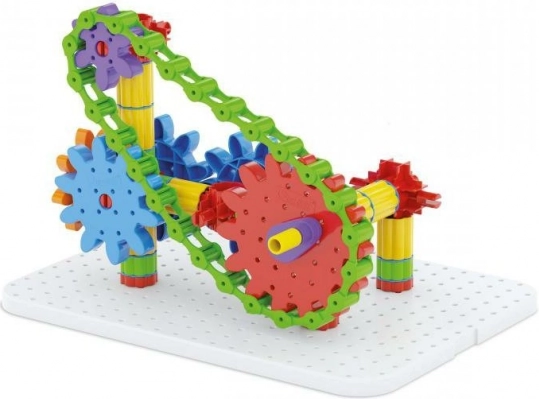De set bevat 100 onderdelen, waaronder tandwielen, een ketting en een basisplaat voor eindeloze bouwmogelijkheden.