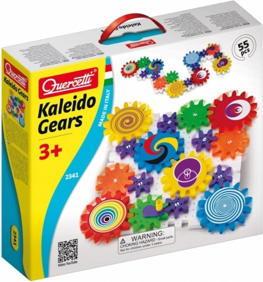De bouwset Quercetti Kaleido Gears bestaat uit geperforeerde platen, assen, tandwielen en figuren van verschillende dieren en bomen. Met behulp van de slinger kan het mechanisme in beweging worden gezet, waardoor kinderen basale mechanische principes kunnen verkennen en leren oorzaak en gevolg te begrijpen.