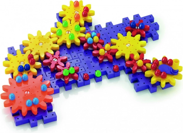 De set met kleurrijke tandwielen en figuren stelt kinderen in staat verschillende structuren te bouwen en tegelijkertijd op een leuke manier de basis van mechanica te leren.