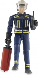 Realistische BRUDER Bworld brandweerfiguur met beweegbare gewrichten en rijk accessoirespakket voor uren creatieve speelpret. Bevat een helm met vizier, portofoon, brandblusser en handschoenen. Gemaakt in Duitsland van hoogwaardig ABS-kunststof en polycarbonaat.