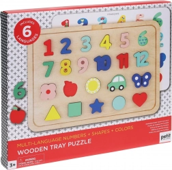 Petit Collage Inlegpuzzel met cijfers en vormen is een geweldige manier om kinderen de basis van wiskunde en vormherkenning te leren. Bevat 22 stukjes en 3 dubbelzijdige kaarten met woordjes in zes verschillende talen: Engels, Spaans, Frans, Duits, Nederlands en Italiaans. De puzzel is gemaakt van hoogwaardig FSC®-gecertificeerd hout, wat een ecologische en duurzame productie waarborgt.