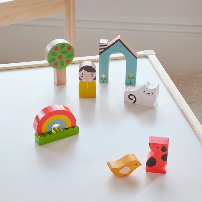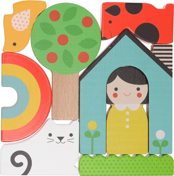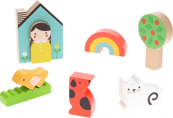 Deze kleurrijke set stelt kinderen in staat om thuis scènes te creëren of als puzzel te stapelen. De stukken zijn ontworpen om goed in kinderhanden te passen en zijn gemaakt van 100% FSC®-hout, wat milieuvriendelijkheid garandeert.