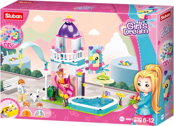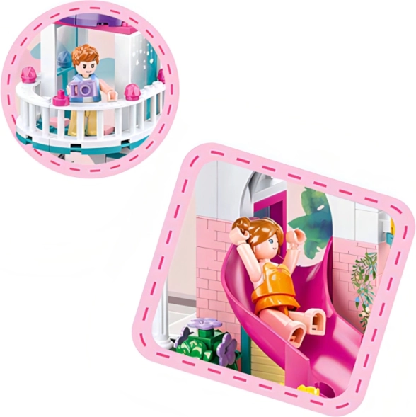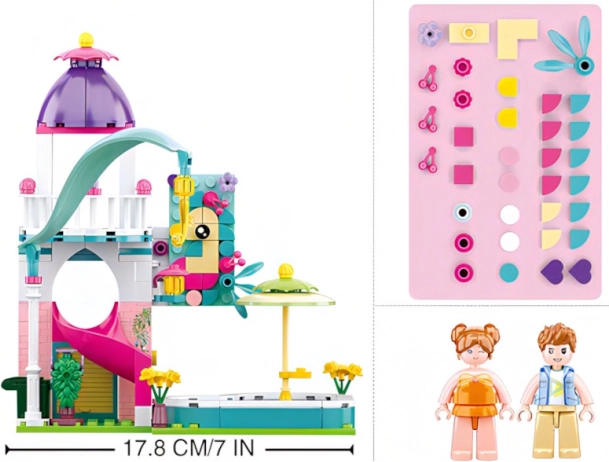 Ontdek de magie van de bouwset Sluban huisje met glijbaan naar het zwembad met 230 onderdelen en twee figuurtjes, ontworpen voor een gemiddeld moeilijkheidsniveau. De figuurtjes zijn innovatief met beweegbare delen en de hele set is gemaakt van hoogwaardig en veilig ABS-kunststof.