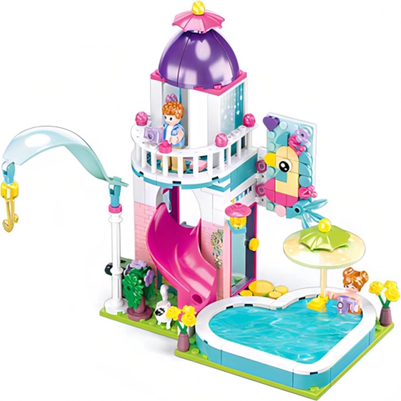 Sluban huisje met glijbaan naar het zwembad is een leuke en creatieve bouwset die eenvoudig te combineren is met andere bouwsets. Het stimuleert de fantasie en motorische vaardigheden van kinderen.