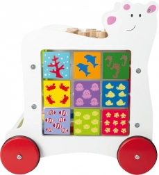 Dankzij de gerubberde wielen is de beweging stil en vriendelijk voor alle vloertypen. Bovendien biedt de loopwagen opbergruimte voor blokken en kleine spulletjes, zodat de speelhoek snel is opgeruimd.