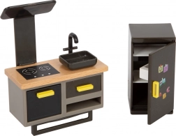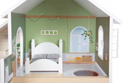 Dit moderne poppenhuis brengt een open woonconcept, waarin kinderen een keuken met eethoek, een slaapkamer, een badkamer en een groot terras met zitje ontdekken. Dankzij de open voorkant is het spel van voren toegankelijk en kunnen meerdere kinderen er tegelijk comfortabel mee spelen. De lichte gevel en gedempte kleuren passen perfect in elk interieur.