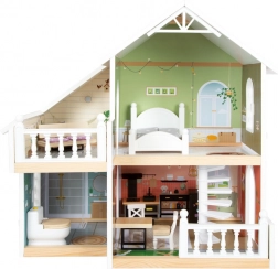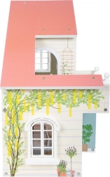 Stijlvol houten poppenhuis met een open voorkant, met drie kamers, een terras en een tuintje voor realistisch spel. Inclusief spiraalvormige trap, openende ramen, moderne badkamer met plexiwand en 8 stuks functioneel meubilair met textiele accessoires. Compact en stabiel uitgevoerd in een licht, modern design, ideaal voor de kinder- én woonkamer.
