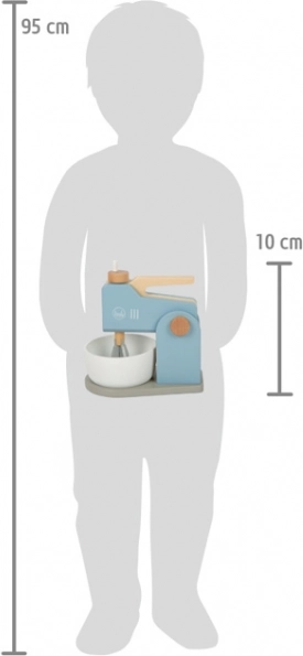 Stijlvolle houten keukenmachine SMALL FOOT Tasty met uitgebreide accessoires zal alle kleine bakkers verrukken. Biedt een handmatig afneembare 2-in-1 mixer, draaibare garde(s), een kom en een set accessoires waaronder een ei met klittenband, boter, textielen koekjes en een deegroller. Inclusief ook een doosje met “bakmix” en een recept met afbeeldingen. De hoogwaardige houten afwerking in rookblauw en wit met natuurlijke details stimuleert de verbeelding, motoriek en sociale vaardigheden van kinderen.