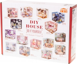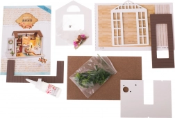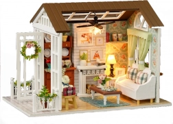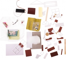 De set bevat alles wat nodig is voor de bouw van de woonkamer en de inrichting, inclusief lijm en gedetailleerde geïllustreerde instructies. De LED-verlichting, die onderdeel is van de verpakking, werkt op batterijen (2x AAA 1,5V en 3x 1,5V LR54 - batterijen niet inbegrepen) en versterkt de algehele sfeer op prachtige wijze.
