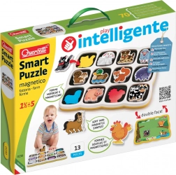 De Quercetti Magnetische Inlegpuzzel Boerderij is een geweldige speelgoedset voor jonge kinderen. Aan één kant van het bord kunnen kinderen magneten in de voorbereide openingen plaatsen, wat helpt bij de ontwikkeling van het herkennen van vormen en kleuren. Dankzij de magneten hechten de afbeeldingsstukjes gemakkelijk en kunnen ze praktisch worden opgeborgen voor later spelen.