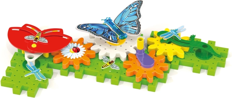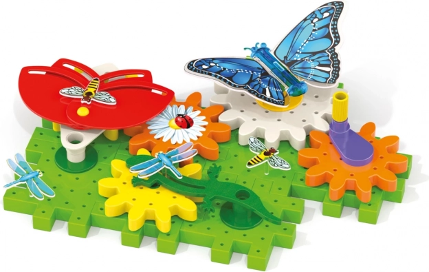 Verbonden tandwielen brengen de vlinder, bloem en waterjuffer in beweging. Kinderen zien meteen hoe beweging wordt overgebracht – leuke mechanica binnen handbereik.