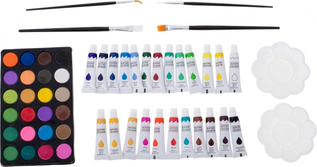 Palet met 24 aquarelkleuren, 24 kleuren in tubes, penselen en twee kunststof paletten – complete uitrusting voor transparante en dekkende technieken.