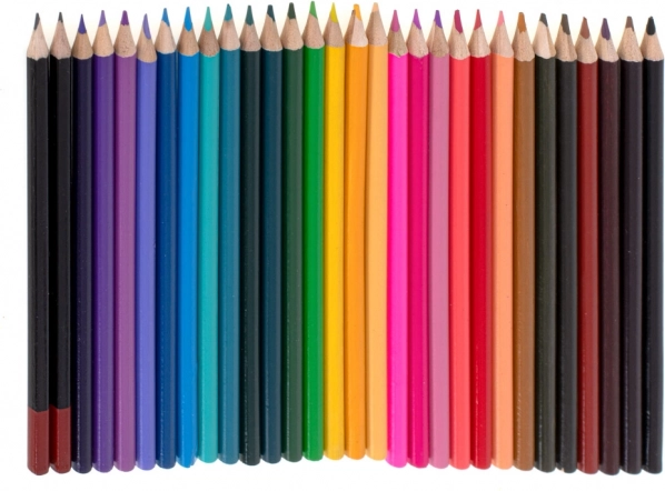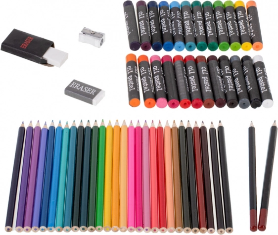 33× stift, 28× kleurpotlood, 4× penseel, 2× potlood, 2× gum, 2× kunststof palet, 1× puntenslijper, 24× aquarelverf (palet), 24× verf in tube, 24× oliepastel, 1× koffer