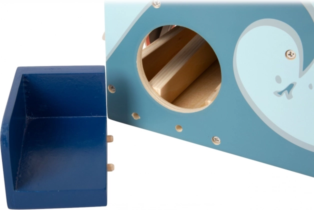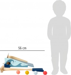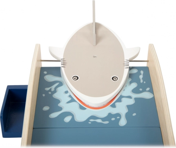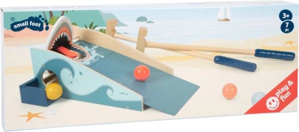 Verander elke kamer of tuin in een mini-golfbaan! De houten minigolf met haaienbek biedt kinderen actieve fun en training van de grove motoriek, oog-handcoördinatie en geduld. Laat het balletje over de blauwe helling als over een golf naar de open bek rollen – bij een treffer sluit de haai zijn bek en vier jij je score.