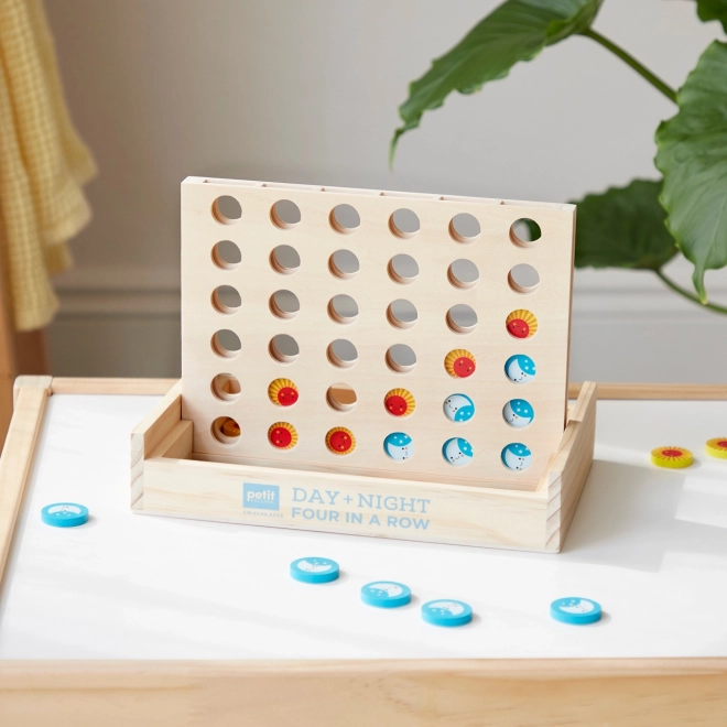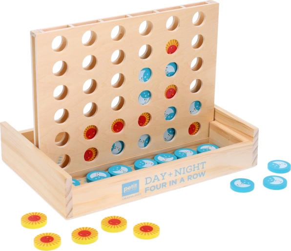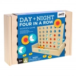 Houten spel Vier op een rij dag en nacht vereist van spelers niet alleen snel denken, maar ook strategische planningsvaardigheden. Het doel is om vier speelstukken op een rij op het rooster te plaatsen. De stukken hebben een aantrekkelijke zon en maan design die zowel jonge als volwassen spelers boeit en verheugt.