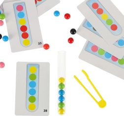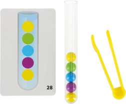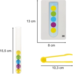Ontdek een leuke en interactieve manier om de vaardigheden van uw kind te bevorderen met deze grote educatieve set. Het spel richt zich op het sorteren van ballen in de juiste buisjes met behulp van de handen of de bijgeleverde pincetten.