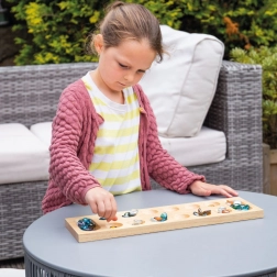 Mancala (ook bekend als Kalaha) is een elegant strategiespel voor twee spelers, dat eenvoudige regels combineert met verrassende diepgang. Deze houten versie van Bigjigs Toys biedt een glad afgewerkt bord en kleurrijke glazen steentjes die uitnodigen tot spel en het trainen van de fijne motoriek.