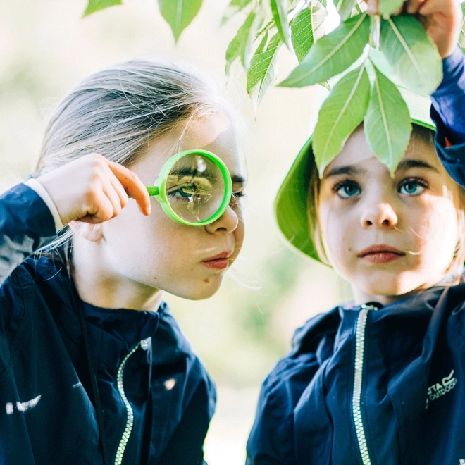 De loep en het doorzichtige potje met deksel laten kinderen details van heel dichtbij onderzoeken, met respect voor de natuur.