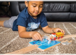 Door te draaien bepalen kinderen de doorgang van de trein: ze blokkeren of openen het spoor en creëren spannende, fantasierijke situaties.