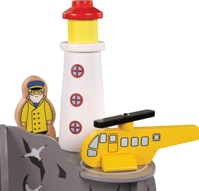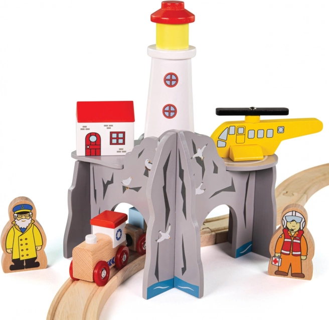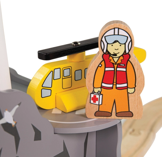 Verrijk de kinder-treinbaan met een kustscène met vuurtoren en helihaven. Deze houten set biedt een kruistunnel met vier uitgangen, een vuurtoren, een helikopter en 2 figuren voor eindeloze verhalen en reddingsmissies. Uitstekend robuust afgewerkt, compatibel met de meeste houten treinbanen en gemaakt van verantwoord verkregen hout met veilige, niet-giftige verven.