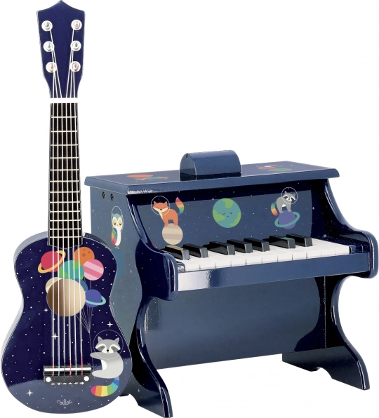We presenteren u de Ruimte Gitaar, het ideale instrument voor kleine muzikanten en liefhebbers van ruimtereizen. Deze kinder gitaar is gemaakt van hout, wat kwaliteit en duurzaamheid garandeert. Het ontwerp is verrijkt met kleurrijke planetaire motieven en een illustratie van een wasbeer-astronoom, waardoor het een ware droom van een speelgoed wordt.