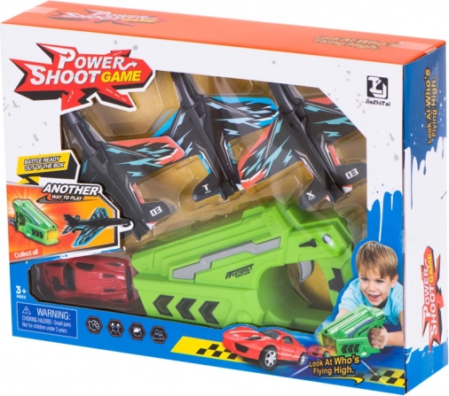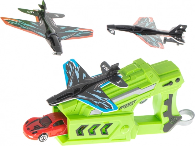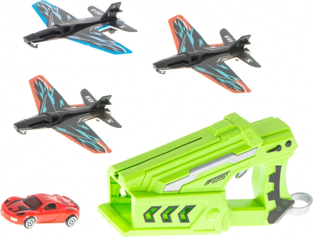 Lanceerpistool met vliegtuigen en autootje – 2-in-1 set (3 vliegtuigen + auto)