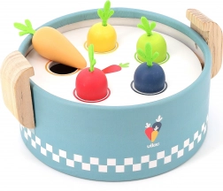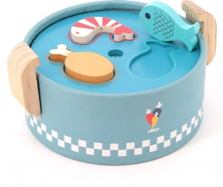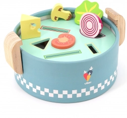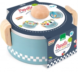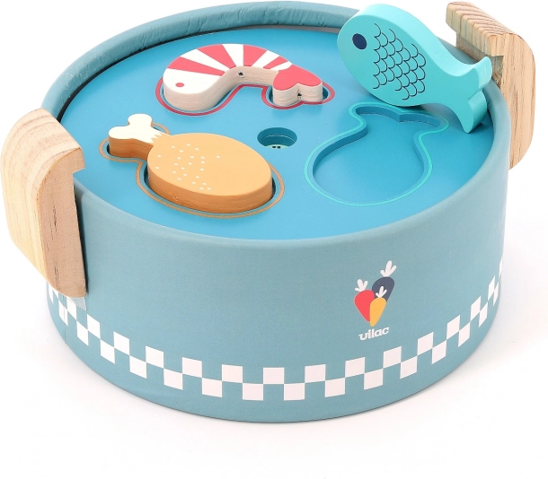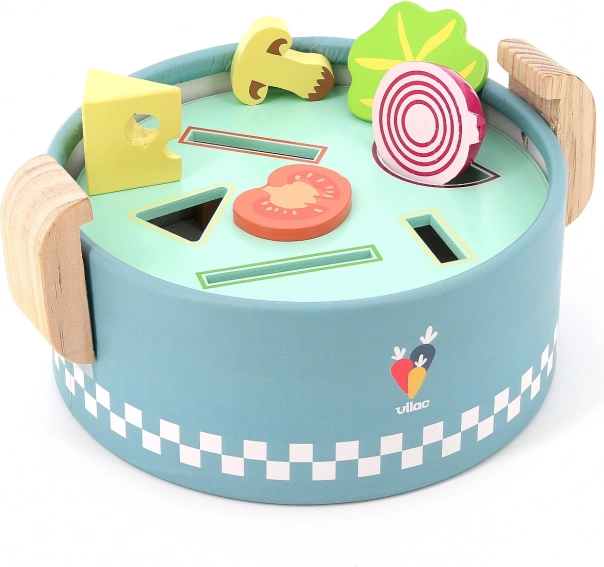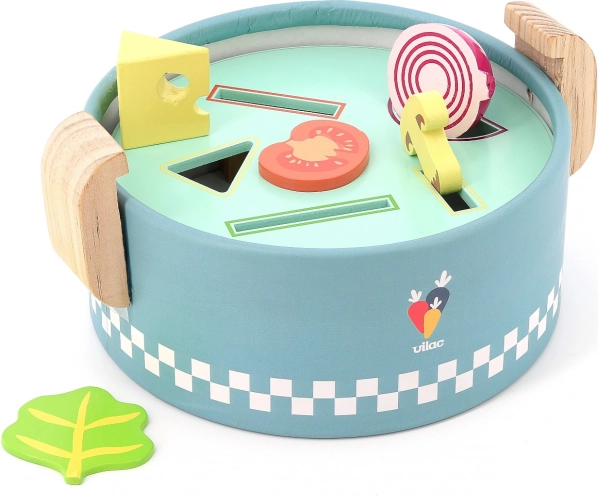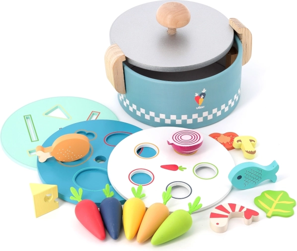 De VILAC insteek mini pot is een slimme houten speelset voor de allerkleinsten vanaf 18 maanden. Onder het deksel zitten drie verwisselbare platen met verschillende vormen, waarin kinderen kleurrijke voedselstukjes plaatsen of laten vallen. Zo ontstaat “koken” als in het echt, wat de fantasie en praktische vaardigheden stimuleert.