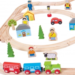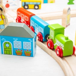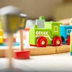 De set is gemaakt van duurzaam hout met metalen onderdelen en magneten voor het eenvoudig koppelen van wagonnetjes. De onderdelen zijn compatibel met de meeste houten treinbanen op de markt, zodat je je spoorweg verder kunt uitbreiden. De veilige constructie en diepe kleuren ondersteunen de sensorische ontwikkeling en fijne motoriek.