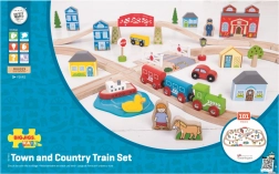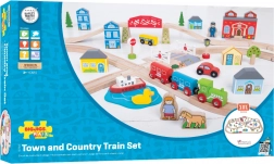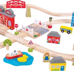 Deze treinbaan stad en dorp biedt kinderen een rijke speelwereld – rijd door de levendige stad, steek de rode brug over, ga verder de natuur in tussen bomen en huisjes en stop bij de kerk of op het station. Auto’s wachten geduldig bij de overweg terwijl de trein op tijd aankomt – ideaal voor het bedenken van eigen verhalen.