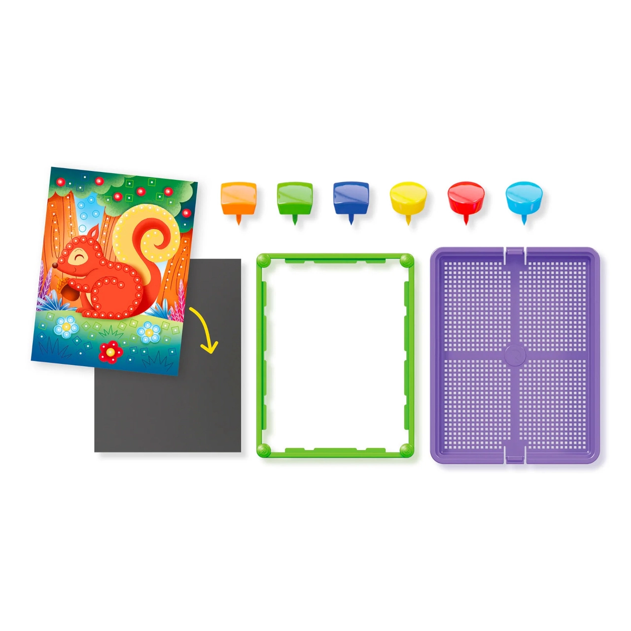 Deze kleurrijke pinnetjesmozaïek boeit kinderen met de mogelijkheid om afbeeldingen te maken aan de hand van de meegeleverde kaarten of hun eigen ontwerpen. Dankzij het intuïtieve insteken in het bord trainen kinderen greep, geduld en visuele waarneming. Robuuste kunststof onderdelen en een frame zorgen voor stabiliteit en gemakkelijk transport.