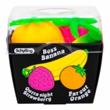 Drie fruitballen in de vorm van een banaan, aardbei en sinaasappel met heldere kleuren bieden visuele en tactiele stimulatie.