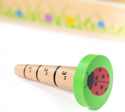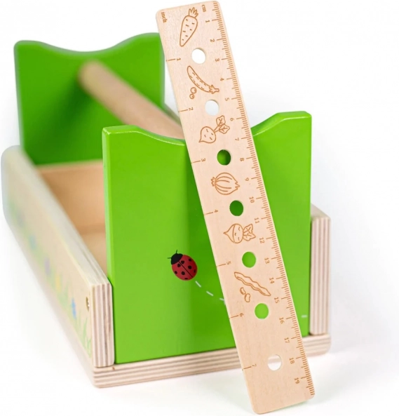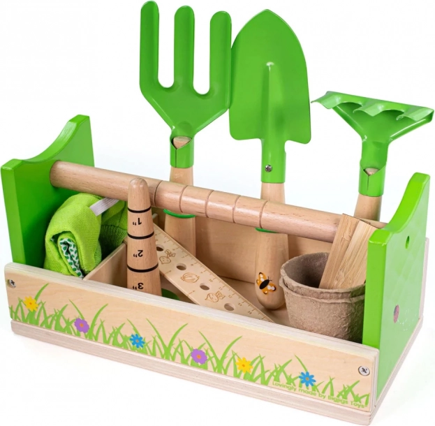 Deze kleurrijke tuinierset stimuleert handigheid, geduld en een band met de natuur. Alles is opgeborgen in een stevige houten krat met een fris groen design met lieveheersbeestjes en bloemen. Kinderen kunnen veilig planten, losmaken of meten en zo de volwassenen nadoen.